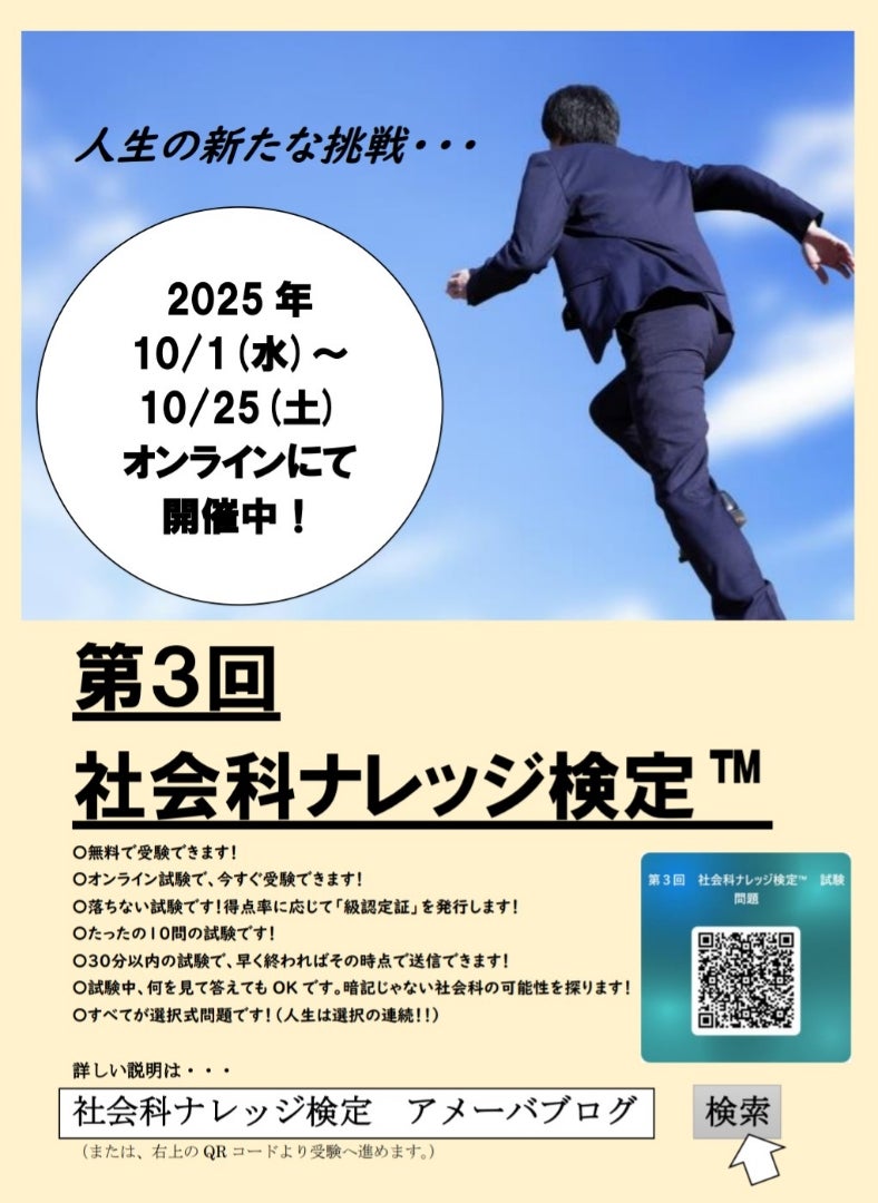 パソコンやスマホで気軽に資格を取りませんか?第3回社会科ナレッジ検定™、本日終了です。