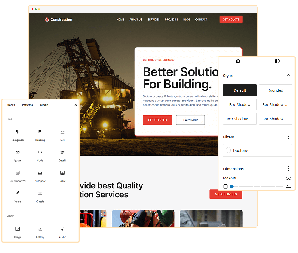 BlocksKit Construction is modern block-based theme where you can build your own unique looking website by using WordPress Blocks Editor. No coding required.