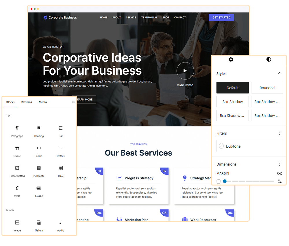Blockskit Corporate Business is a modern and versatile WordPress theme created especially to build versatile sites such as agency, business, company, consulting, corporate, digital agency, finance, financial, marketing and all other corporate websites without a single line of coding. It offers full-site-editing, allowing easy customization of all aspects of your site. With multiple templates, patterns, and style variations, it’s suitable for different aesthetics.