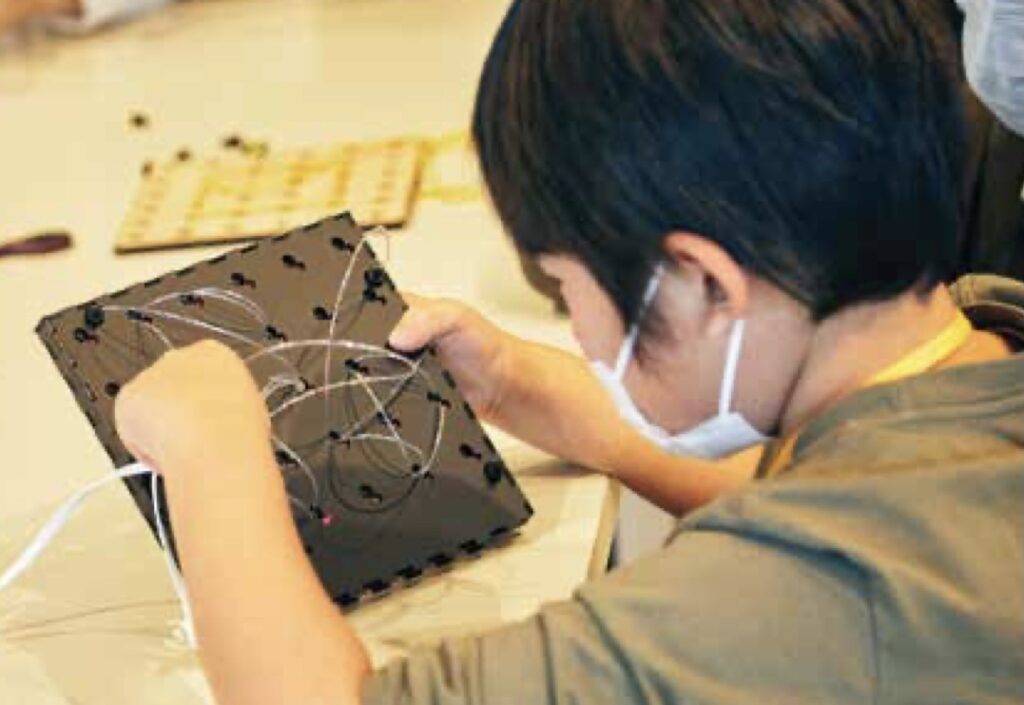 Developed by researchers from the Keio Graduate School of Media Design and University of Auckland, TIEboard is an interactive digital tool aimed at teaching kids geometric concepts. It is a bit like the classic Lite-Brite toy, but for geometric shapes and smart enough to guide learning. It consists of a grid of points, each of which is a hole that can be lit by an LED and accept a “thread.” Those threads are fiber optic and light up. They’re also conductive and make contact with pads around the holes.