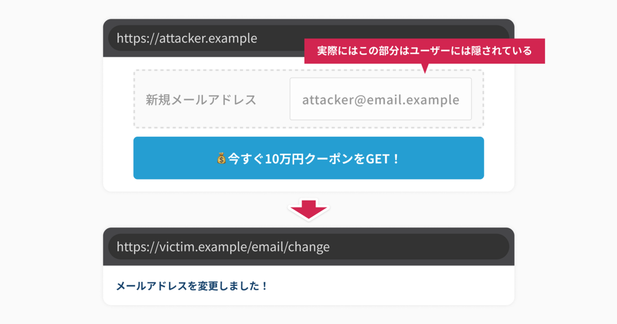例えば、以下の図に示す攻撃者が用意したWebサイト上には「今すぐ10万円クーポンをGET!」というボタンがあります。このボタンをユーザがクリックすると攻撃者が用意したフォームの内容が送信され、攻撃対象となるWebアプリケーション(正規Webサイト)に対しメールアドレス変更リクエストが送信されます。