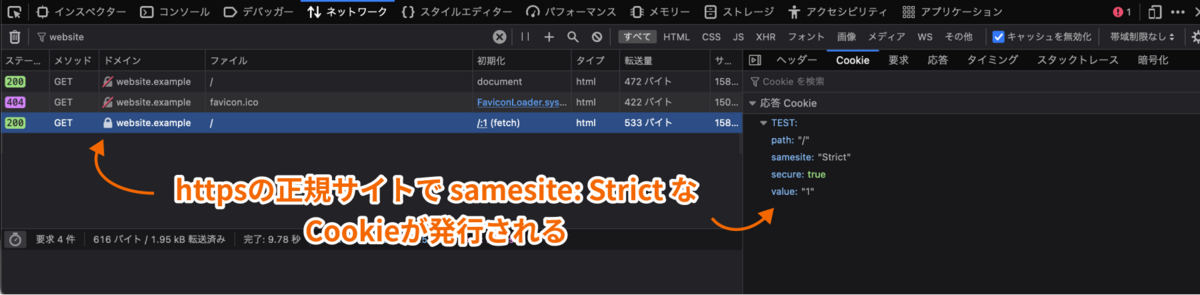 まず、1発目のAJAXによる通信でレスポンスにSameSite: StrictなCookieが帰ってきています(/etc/hosts で手元に向けたダミーのドメインで確認しています)。見やすさのためAJAXを利用していますが、通常通りWebサイトを利用しようとしてhttpsのサイトにブラウザでアクセスしてもこの手順と同じ結果が得られます。