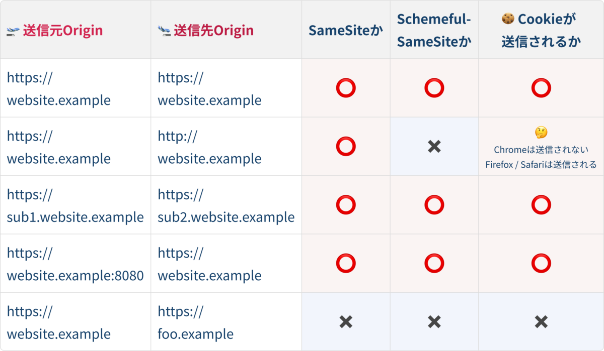 つまり、現状スキームだけが違う2つのURLを同じサイトと見なすかどうかは未定義であり、ブラウザによって対応状況が分かれているようです。 スキームまで一致したサイトを"Schemeful-SameSite"と呼ぶケースもあります。