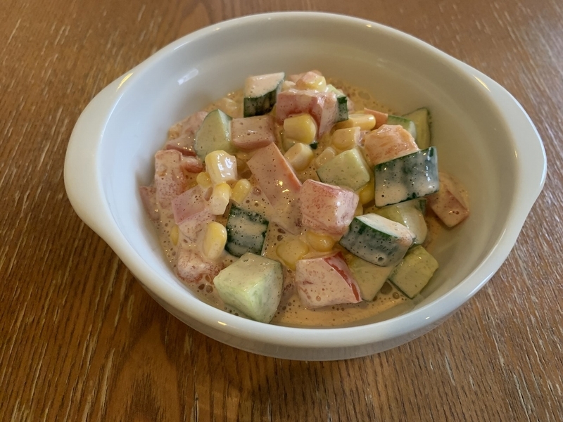 id:enshintarouさんです。トマト・きゅうり・コーンの3つの食材と調味料を混ぜ合わせるだけで出来上がり。特別感があるのに簡単で、お得なレシピです。