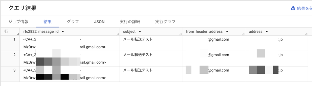 上記のクエリを実行すると転送されたメールが存在する場合、以下のような結果が出力されます。