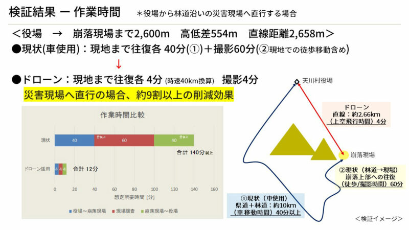 加えて、土砂崩れなどで道路が通行止めになっていても最短距離で飛んでいけますので、災害確認の作業時間を大幅に短縮できます。崩落現場の位置が概ね分かっている場合、想定した検証では、現状140分かかる作業時間がドローンだと12分に、9割以上短縮可能という結果となりました。