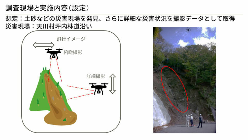 奈良県吉野郡 天川村のご協力のもと、土砂崩れ発生を想定し、その際のドローンの有用性について検討を行いました。天川村は、面積の大半を山林が占めており、台風や大雨による土砂崩れがよく発生します。村役場の職員の方々は、都度、災害の状況を確認する必要がありますが、安全を確保しながら、また、車で移動できる範囲も限られることから、現場到着までに相当の時間を要することがあります。