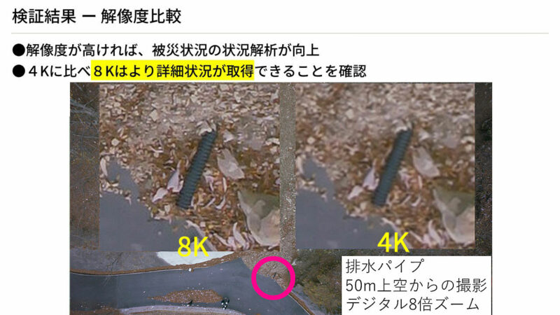 8Kと4Kの画像比較も行いました。先ほど申し上げたように、8Kの情報量は4Kの4倍です。50mの上空から撮影した排水路の破損状況の画像を比較すると、4Kのデジタルズーム画像では分わかりにくい部分もありますが、8Kだとはっきりと確認できます。
