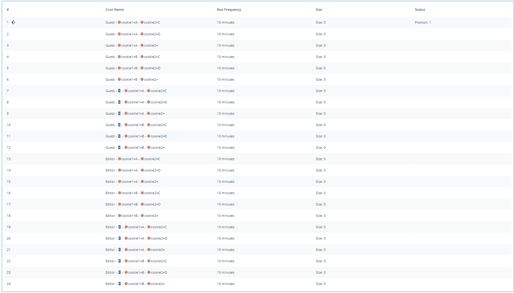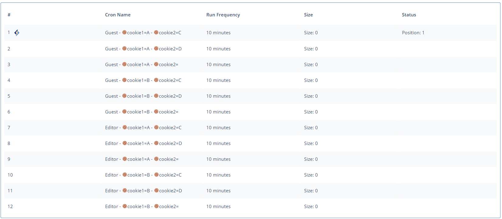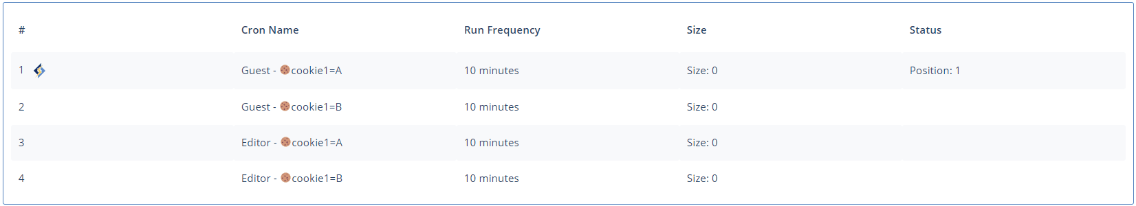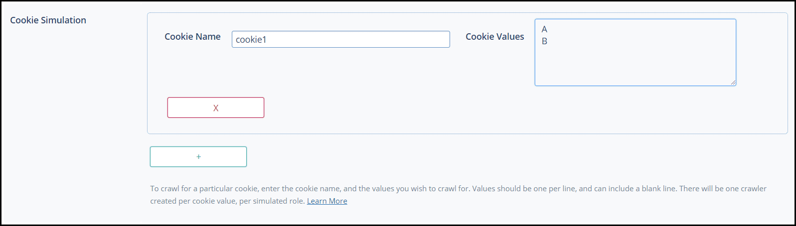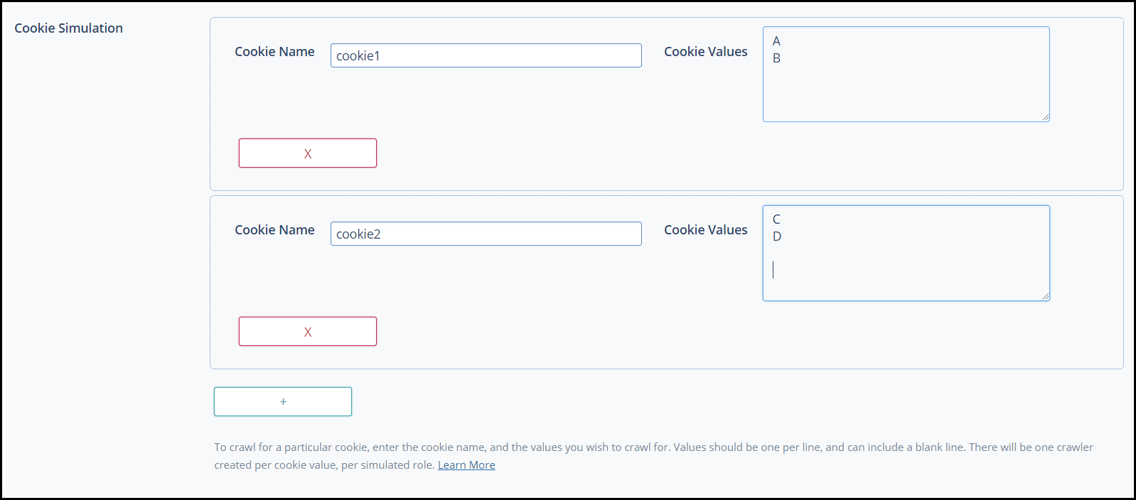 Press the + button to add additional cookies, but be aware the number of crawlers grows quickly with each new cookie, and can be a drain on system resources. Let’s add cookie2 with the values C, D, and .