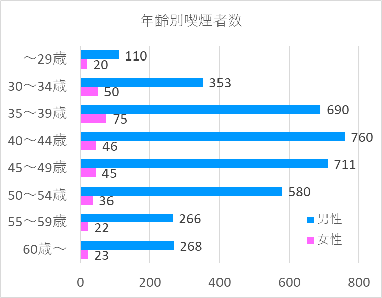 喫煙者数はIBJ全体で男性が3,738人、女性が317人となりました。