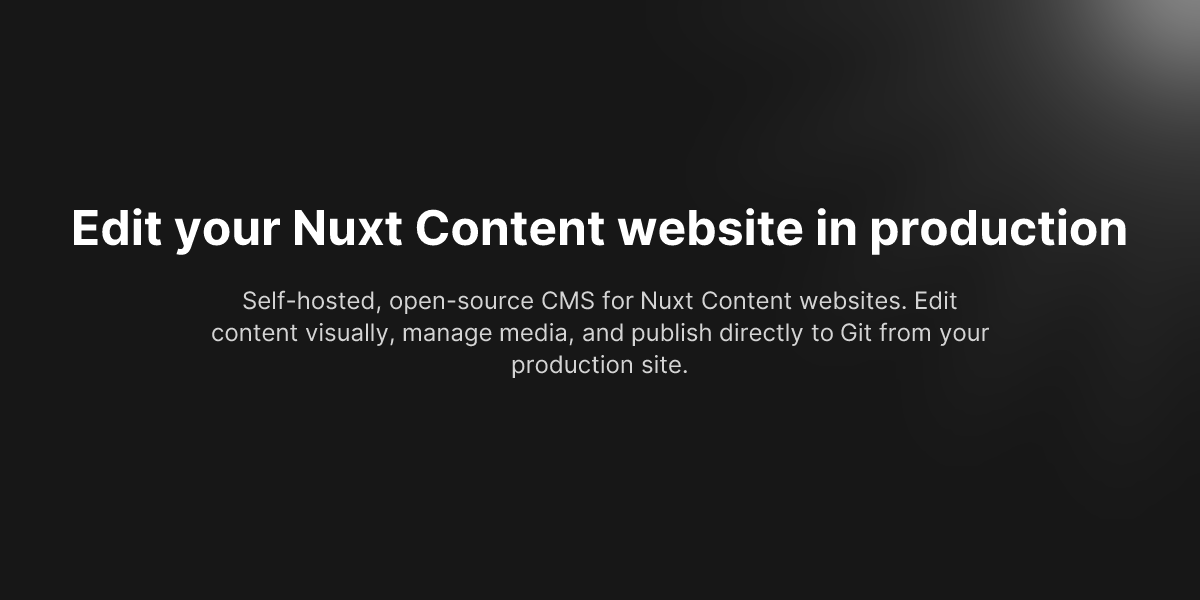 Self-hosted, open-source CMS for Nuxt Content websites. Edit content visually, manage media, and publish directly to Git from your production site.