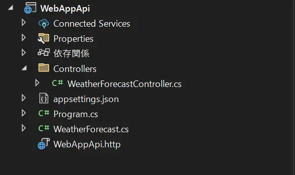 一番簡単な方法は、Visual Studioの新規作成から「ASP.NET Core Web API」でプロジェクトを追加することです。追加すると以下のような構成のプロジェクトが追加されるのではないでしょうか。