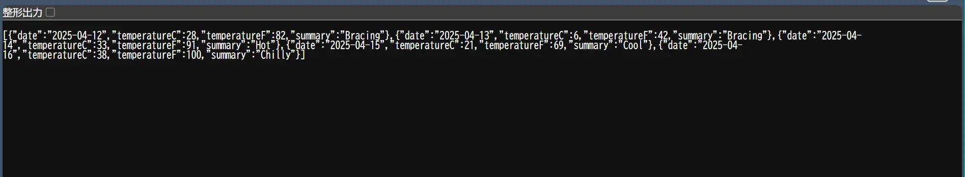 このWebページが表示されている間はHTTPサーバーとして機能します。ブラウザで別タブを追加して「localhost:7170/WeatherForecast」を実行してみましょう。すると以下のような表示が行われるのではないでしょうか。