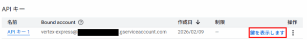 「鍵を表示します」をクリックしてAPIキーをコピーしておきます。