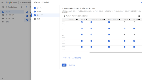 - 「スキーマの確認とキープロパティの割り当て」で各種情報を入力し、「続行」をクリックします。