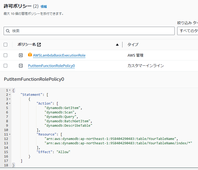 ここでは、全く使用しないのですが Lambda 関数に YourTableName という Amazon DynamoDB テーブルの Read Only 権限を与えています。このように AWS があらかじめ用意した権限パターンセットを使うと簡単な権限定義ができます。