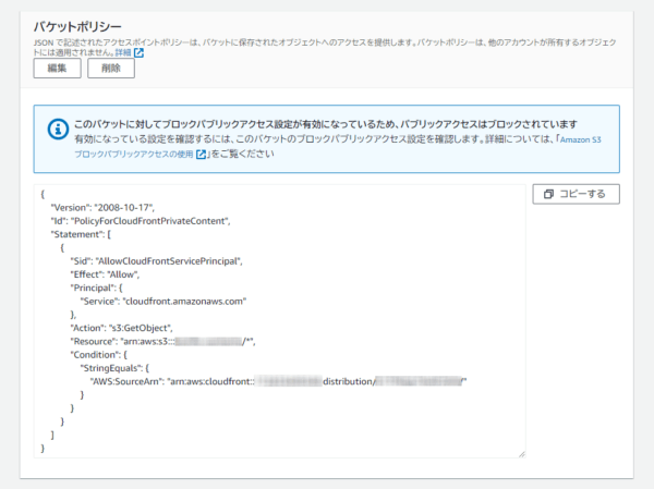 S3バケット設定(アクセス許可)に移動しますので、バケットポリシー設定の編集をクリックし、コピーした内容を貼り付けます。以下のような内容になると思います。
