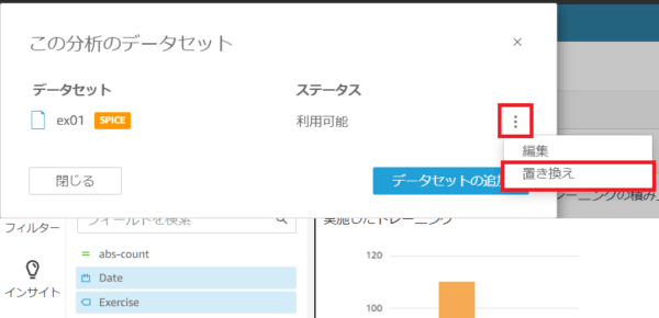 2. この分析のデータセット がポップアップしますので、三点 → 「置き換え」の順でクリックします。