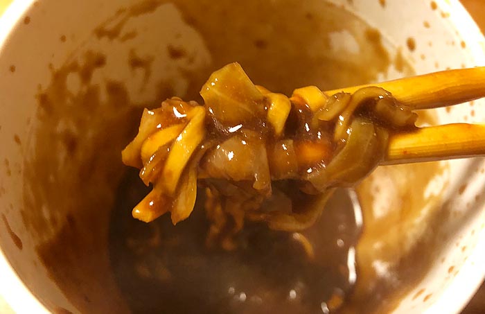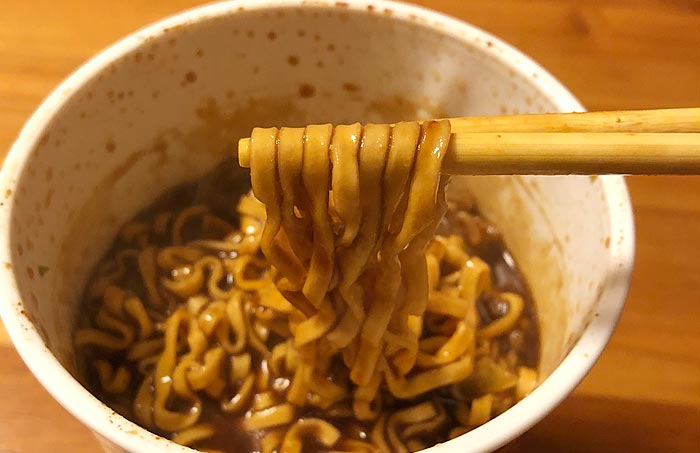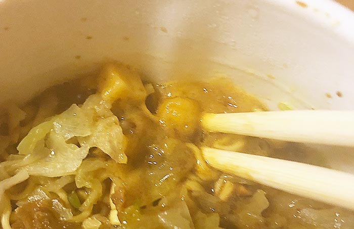 そして、麺はご覧の通り大量に使用された粉末スープによって若干確認しにくいんですが…こちらもまた食べ応えのある厚い太めの麺が採用されているようで、若干ちぢれもあることから、濃厚なカレースープもよく絡むことを想像させます!