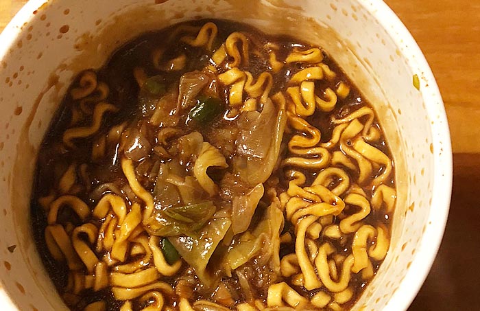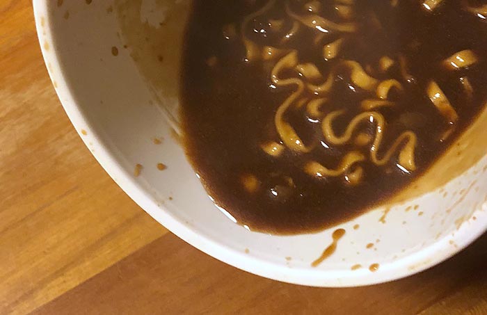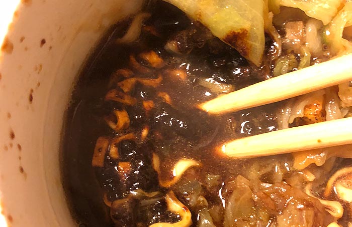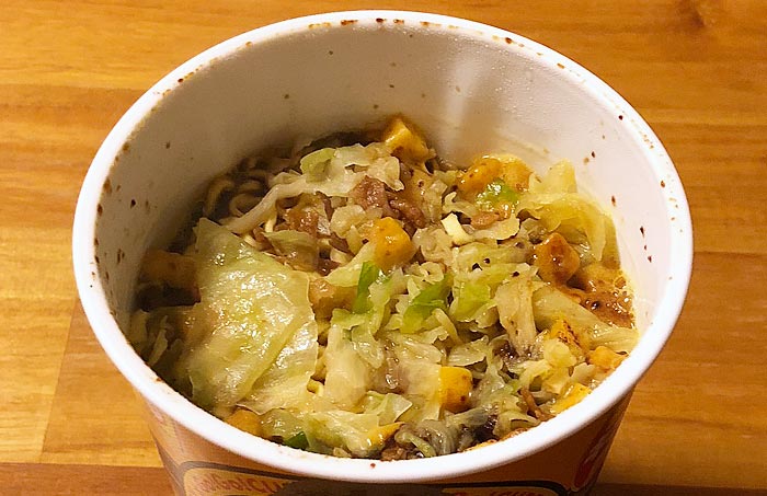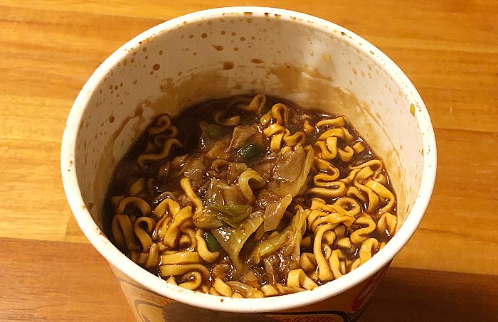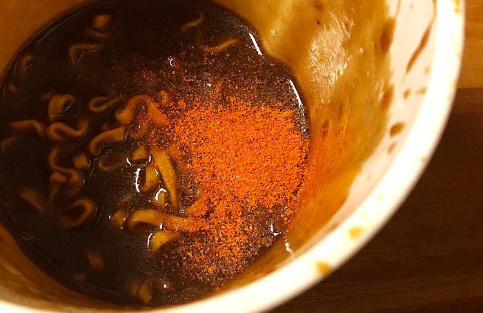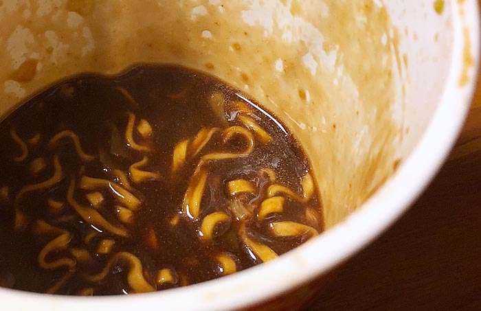 これは…粉末スープが容器に大量に溜まっているのでしょうか?先ほど入れたお湯をかなり吸っていて、この時点ですでに濃厚なドロッとした仕上がりを思わせる食べ応え抜群な一杯…といった印象の出来上がりです。