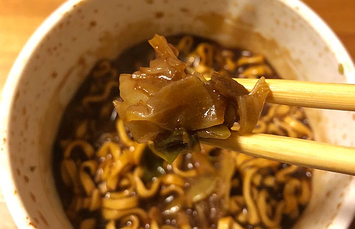 トッピングにはまず、こちらのキャベツが入っていて、意外と量も多く、シャキシャキとした良い食感に仕上がったことで、濃厚なカレーヌードルにちょうど良いアクセントをプラスしているようです!