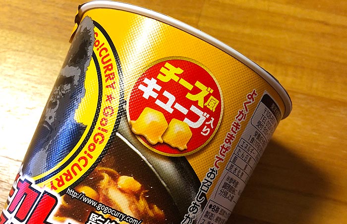 「ゴーゴーカレー」とのタイアップ商品です。黒くてスパイシーな濃厚カレースープに、チーズ風キューブを加えた、コクのあるカレー味ヌードルです。