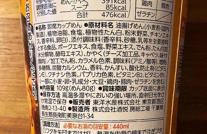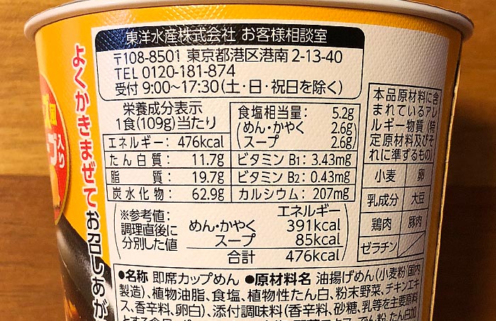 ご覧の通り476kcal(めん・かやく391kcal / スープ85kcal)となっております。(塩分は5.2g)