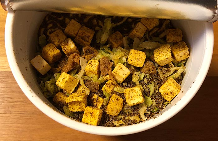 フタを開けてみると、ご覧の通り粉末スープや具材などがすでに入っていて、さっそく風味をチェックしてみると…非常にスパイシーなカレー独特の香りが漂い、早くも食欲そそる仕上がりには期待してしまいますね!