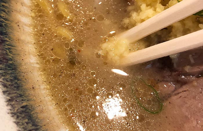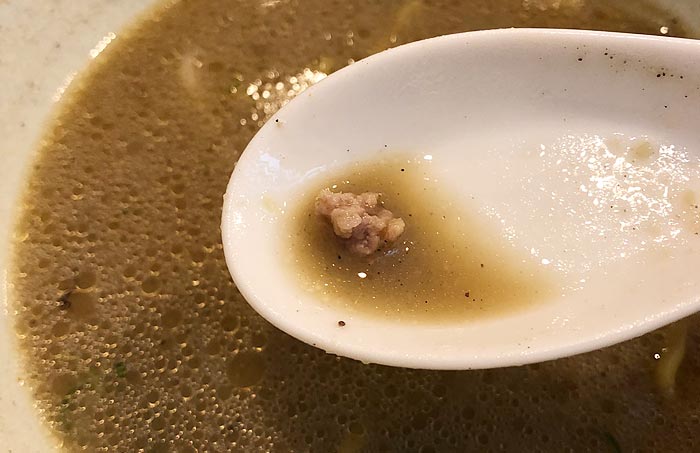 また、先ほどのチャーシュー2種類の他にもご覧の通りひき肉のような具材がスープ底に沈められており、こういった肉の旨味からも食べ進めていくに連れて美味しさなんかも増していく…そんな考え抜かれた一杯には関心…というか“なるほどな〜”と、ひとつひとつ頷きながら楽しめます!