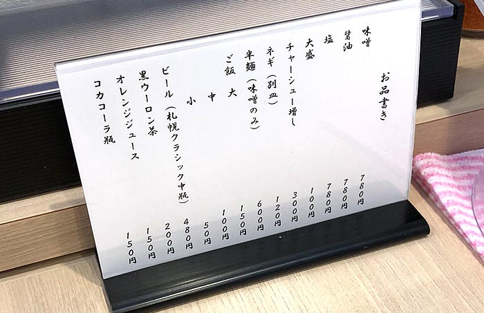 その他、大盛やチャーシュー増し、ネギ(別皿)、辛麺(味噌のみ)、ご飯各種などが用意されています!