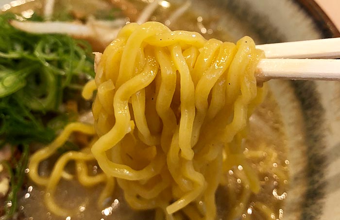 麺は暖簾にも記載されていたように、森住製麺による中太“ちぢれ”の付いた非常にコシの強いブリッブリなコシといった食感が楽しめるやや黄色みがかった卵麺が採用されていて、これがまためちゃくちゃ美味いっ!!!