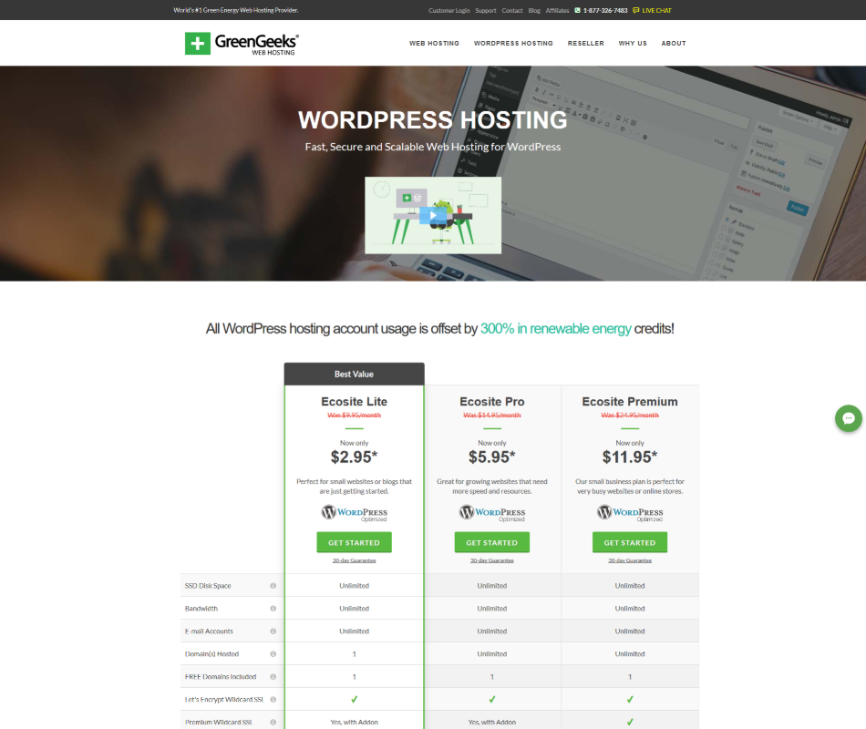 | GreenGeeks | $2.95 – $11.95 | Unlimited | Unlimited | 1 – unlimited sites | 1.400 s | 0.178 s |