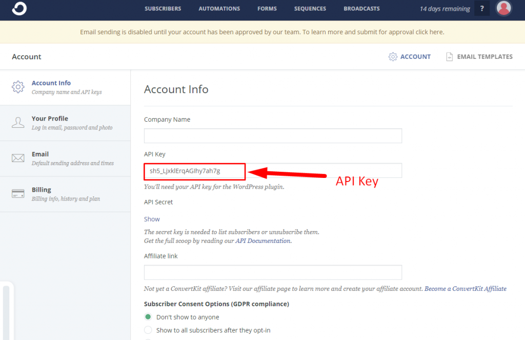 - Once you are in the Account Settings Dashboard, copy the API Key from the Account info.