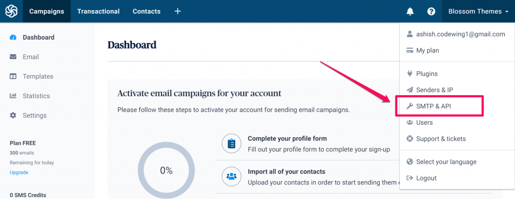 - Enter your credentials, activate the account, and complete your profile. You reach the dashboard of your Sendinblue account.
