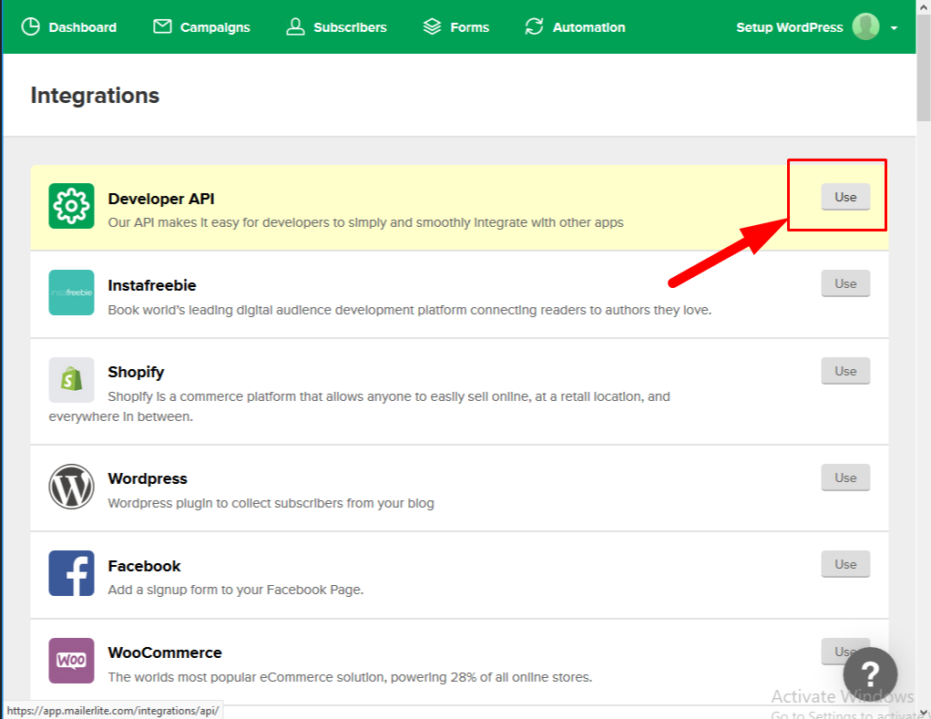 - Paste the API Key from your MailerLite account. If you have an email list on your MailerLite account, you can also select the list you want to add new emails.