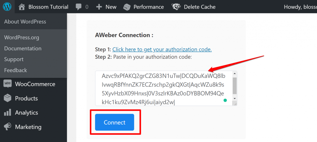 - You can see a button that reads, “Click here to get your authorization code” in the AWeber Connection section. Click on it to open a new browser from AWeber.
