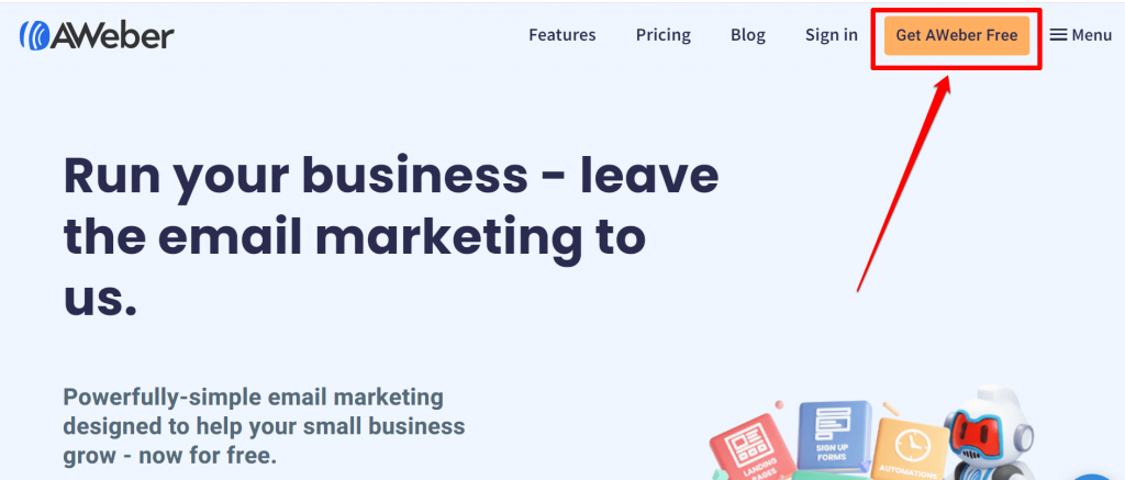 - Visit the official website of Aweber. Please click on the Get Aweber Free button on the right side of the header bar. If you have an existing account, then click on the Sign In button instead.