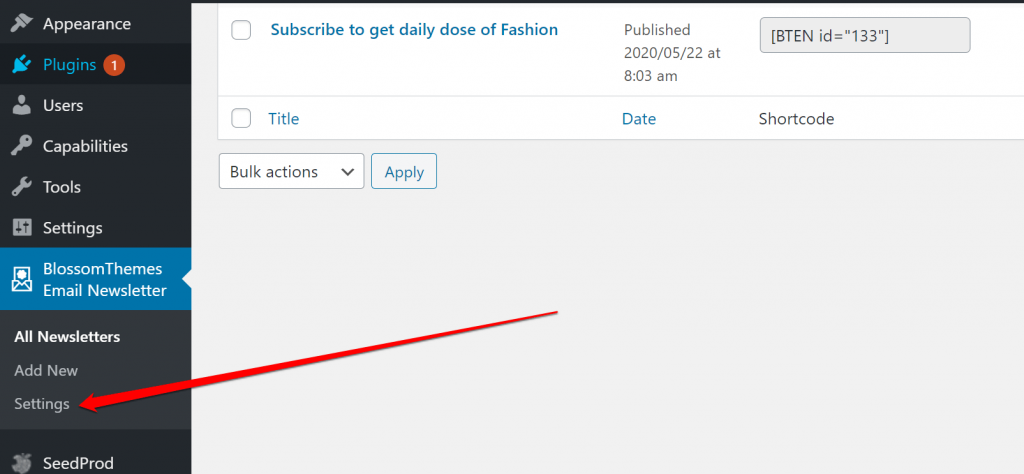 - Click on the BlossomThemes Email Newsletter button and select the Settings option below it.