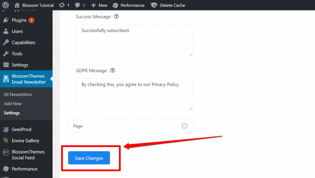 - Make other changes to your Blossom Newsletter Settings interface. Scroll down and you can see a Save Changes button. Click on it after you finish the edits.