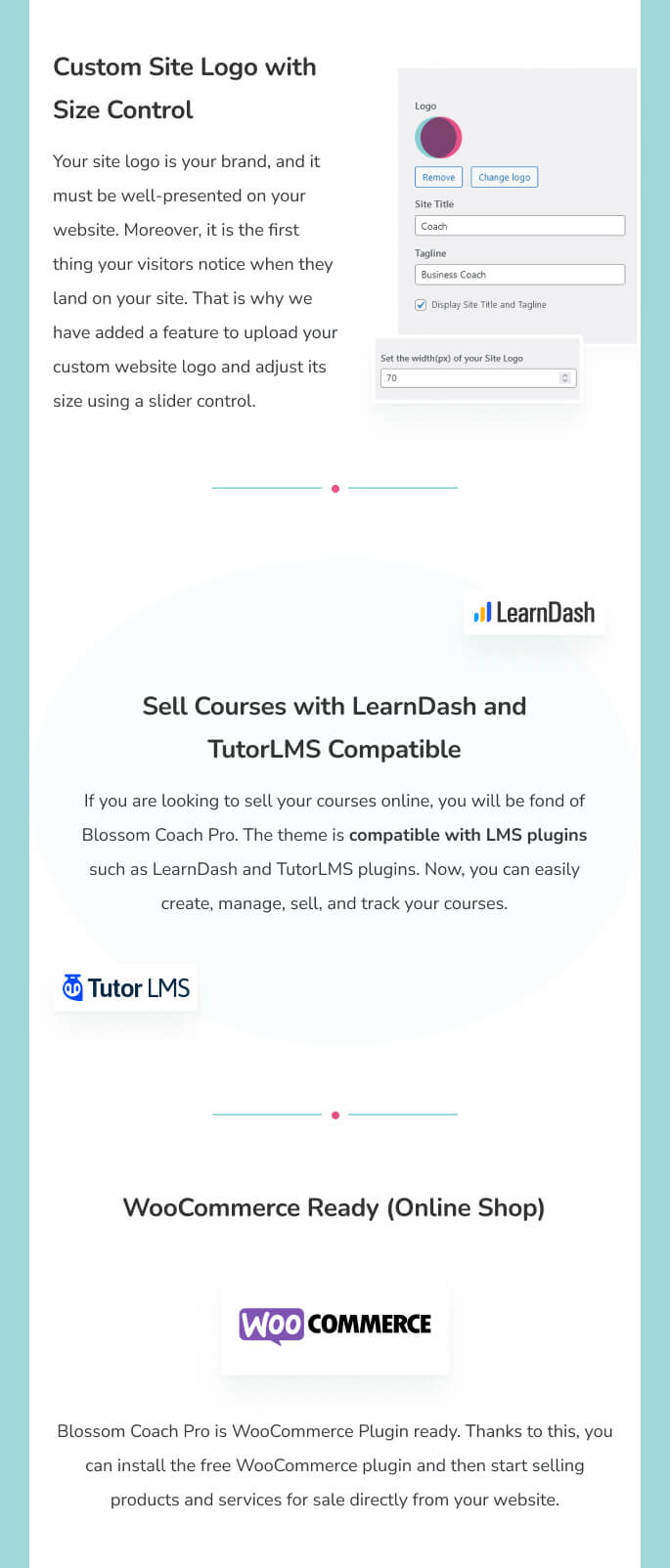 Blossom Coach doesn’t stop here. The theme is compatible with LearnDash and Tutor LMS plugins to enable you to create, track, manage, and sell your courses online. Also, it is WooCommerce compatible so that selling your products and services is conveniently easy.