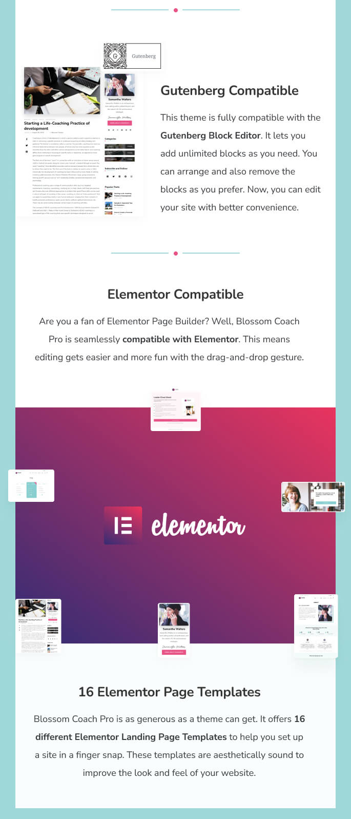Are you a fan of Elementor Page Builder? Well, Blossom Coach Pro is seamlessly compatible with Elementor. This means editing gets easier and more fun with the drag-and-drop gesture.