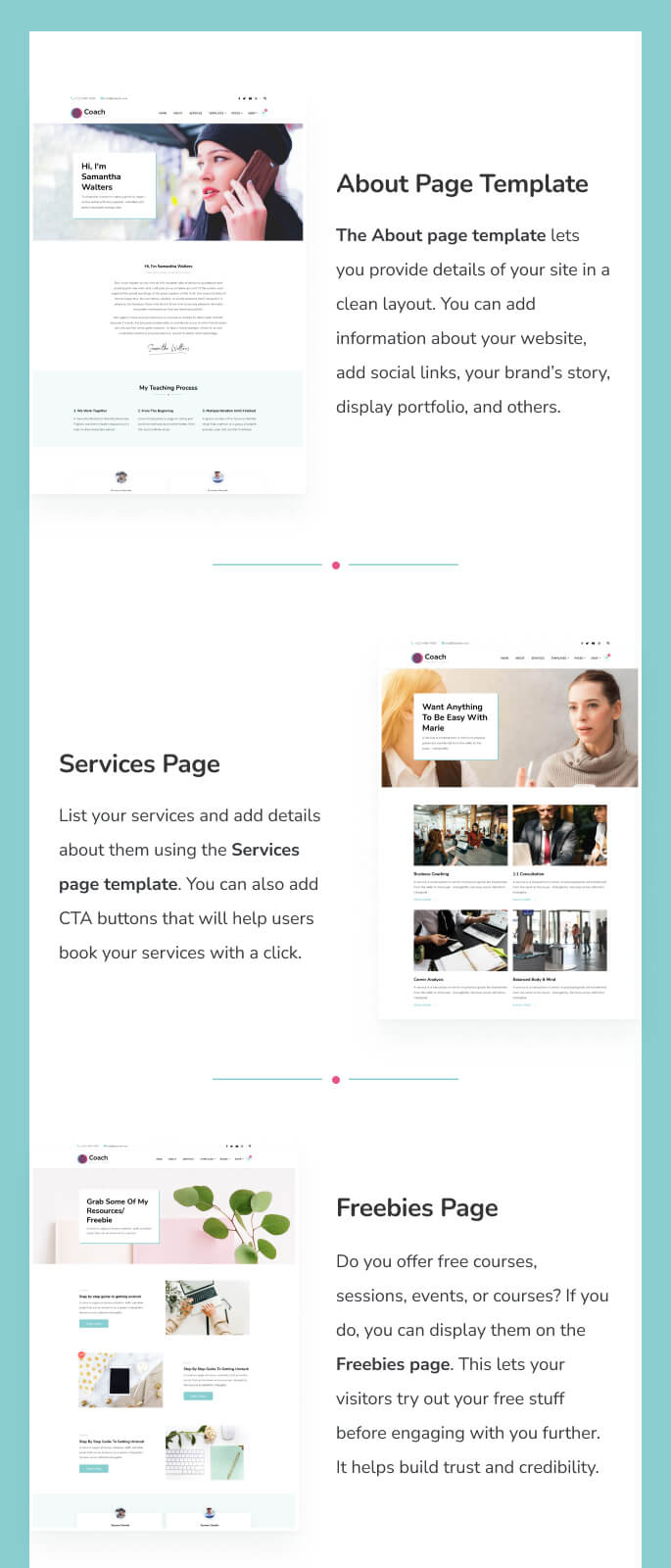Do you offer free courses, sessions, events, or courses? If you do, you can display them on the Freebies page. This lets your visitors try out your free stuff before engaging with you further. It helps build trust and credibility.