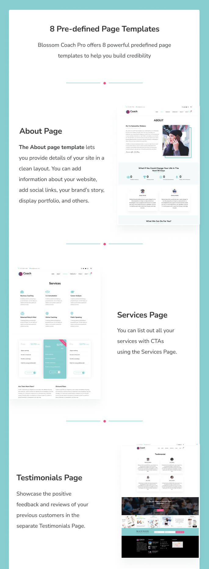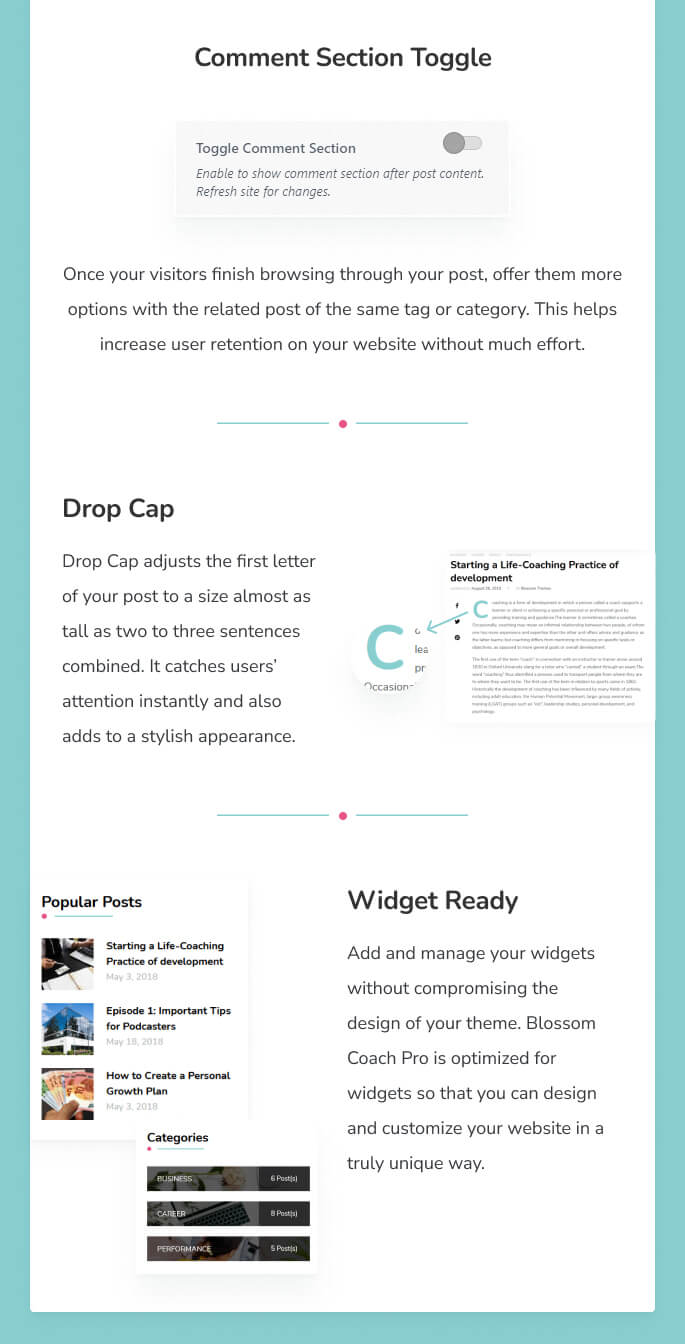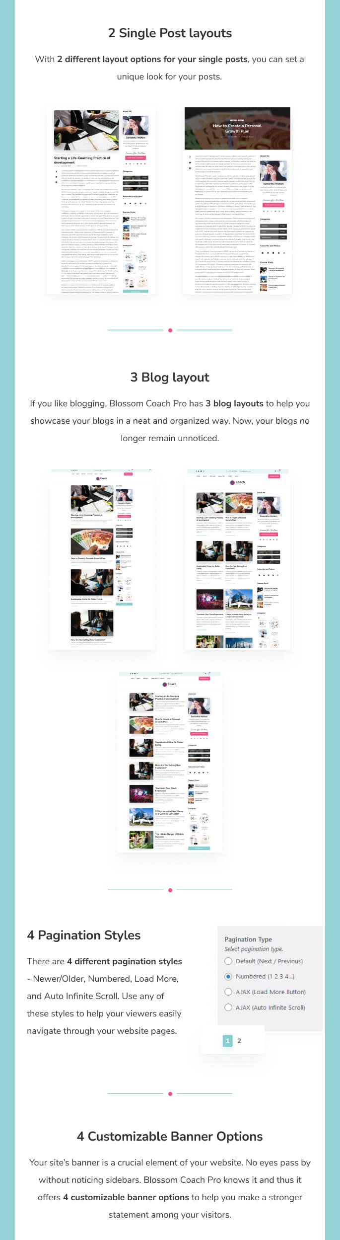 The Blossom Coach Pro WordPress theme features multiple premade templates and layouts for various segments of your website. You can use these features to set up an elegant page without going through any trouble.