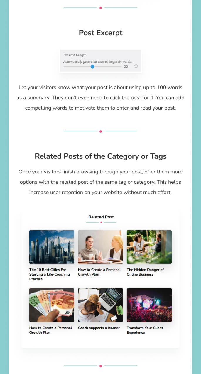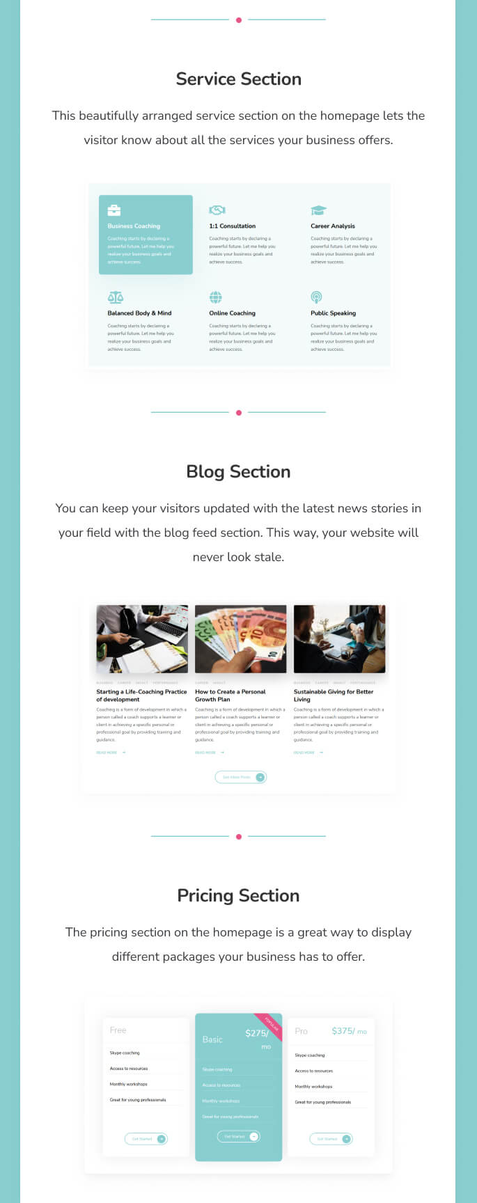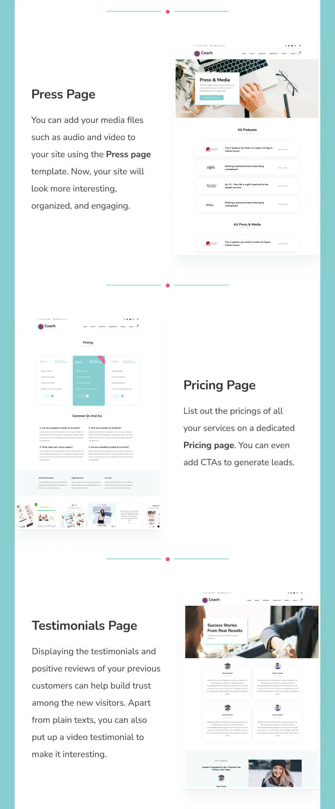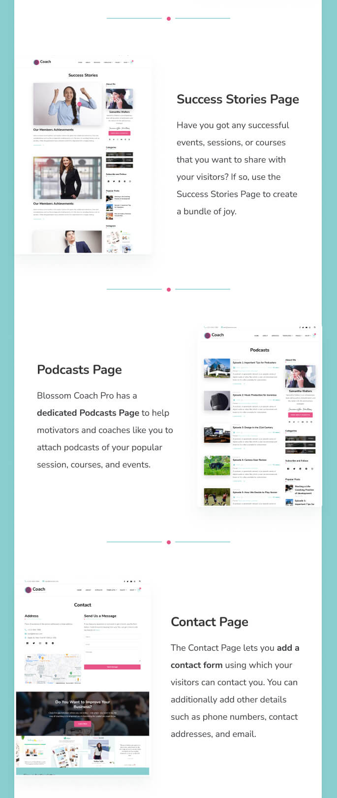 The Blossom Coach Pro WordPress theme features multiple premade templates and layouts for various segments of your website. You can use these features to set up an elegant page without going through any trouble.