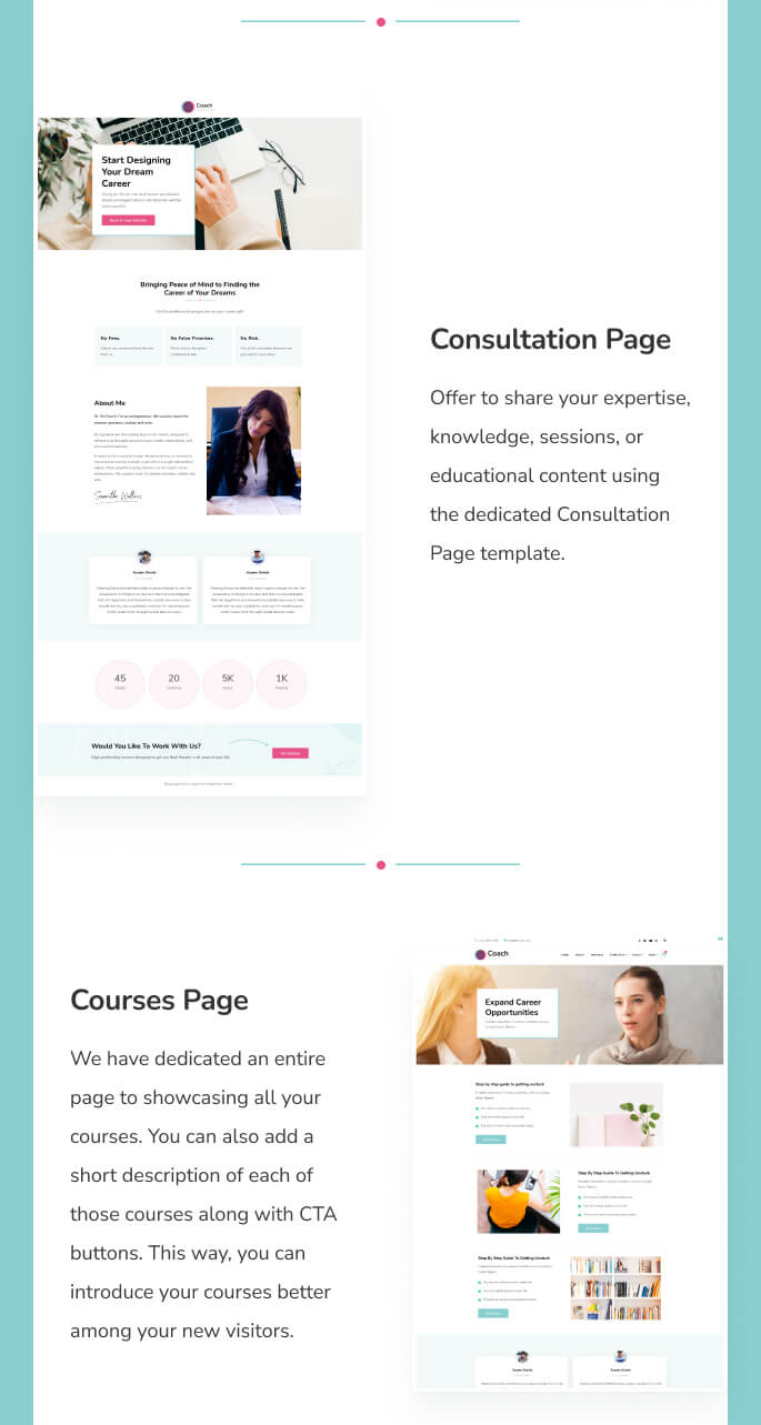 We have dedicated an entire page to showcasing all your courses. You can also add a short description of each of those courses along with CTA buttons. This way, you can introduce your courses better among your new visitors.