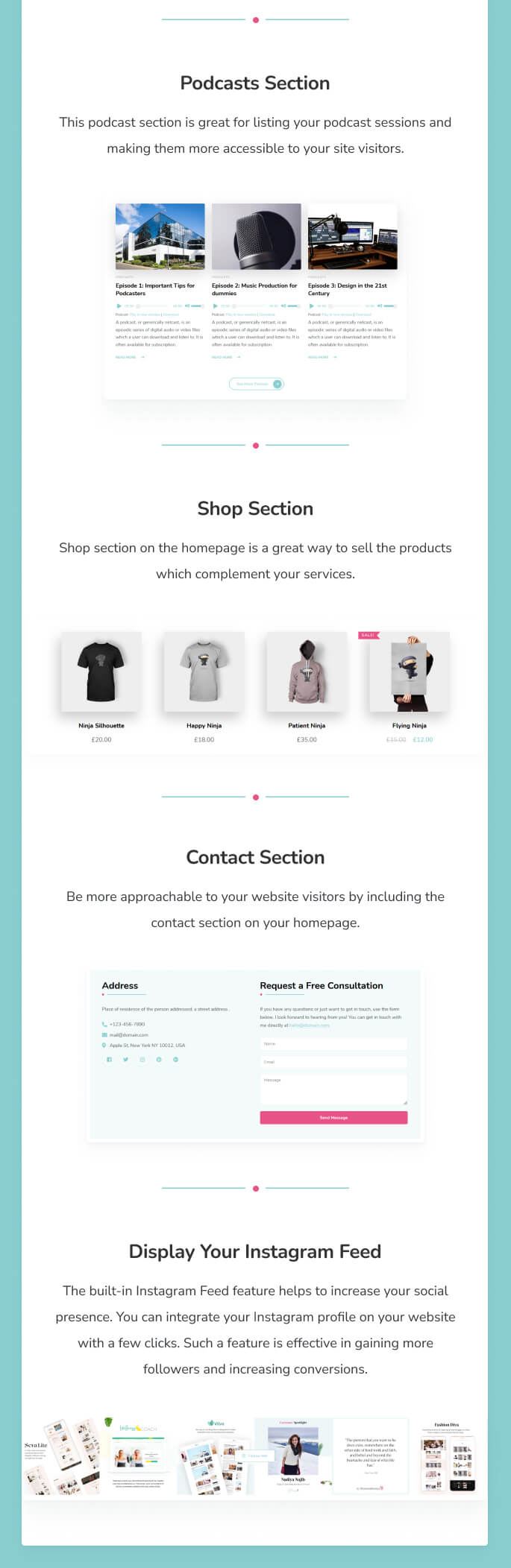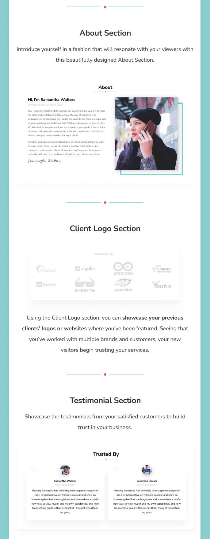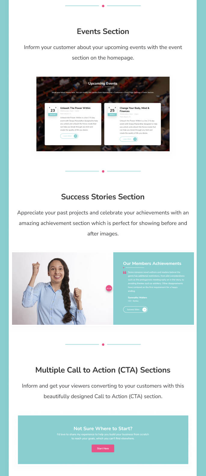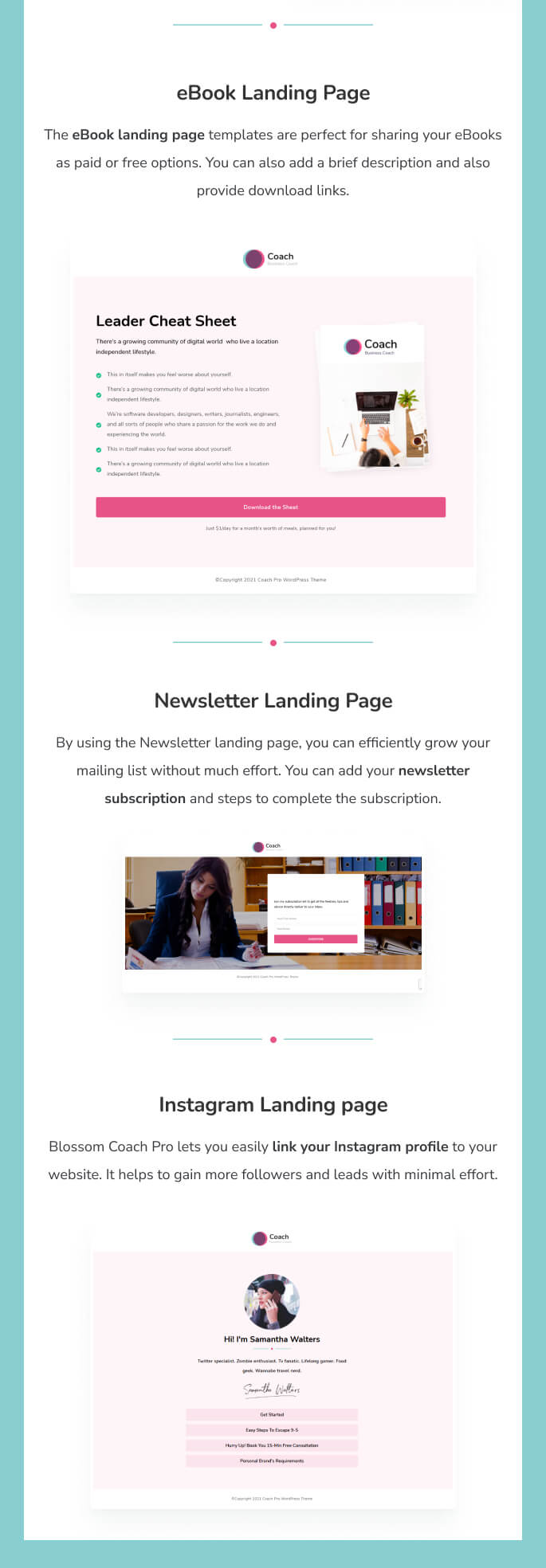 Talking about lead generation, Blossom Coach Pro leaves no stone unturned. It compiles various features such as customizable banners with CTA buttons and appointment form, a strategically-placed newsletter section, eBook landing page, multiple CTA sections, and social media integration.