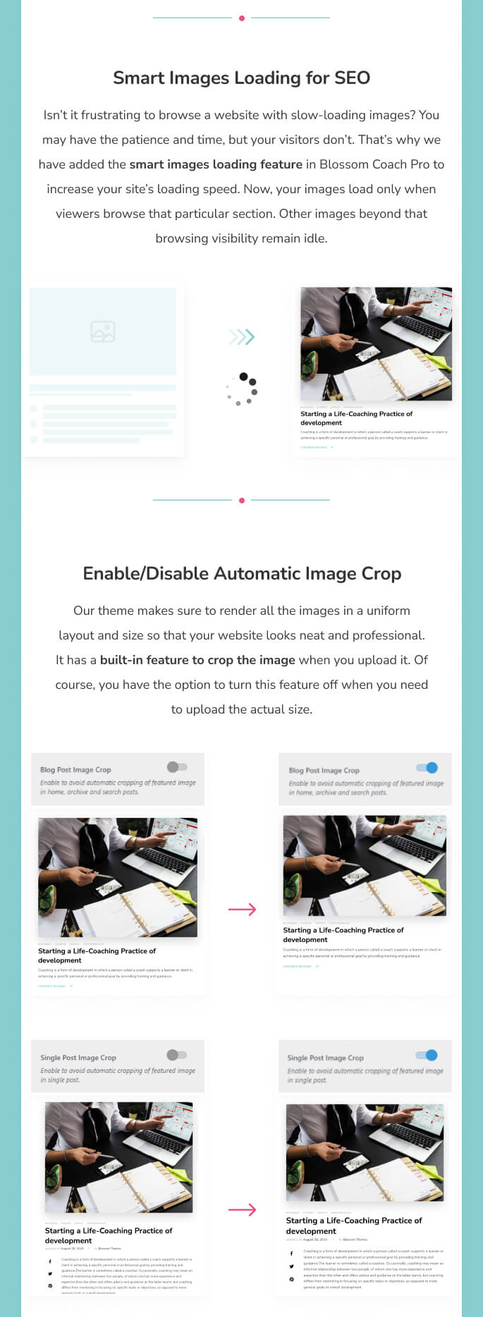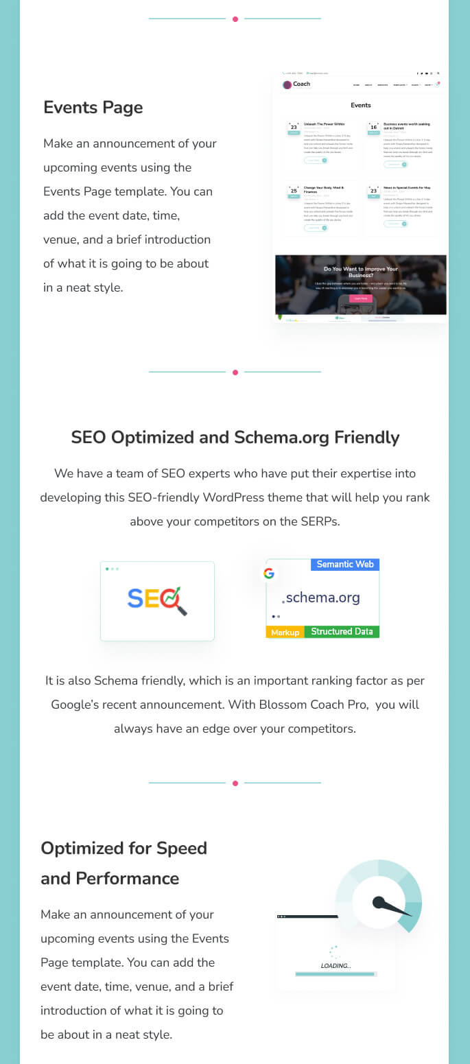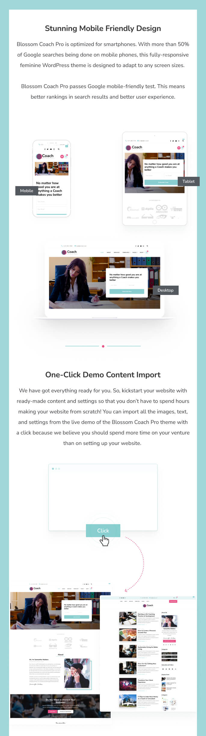 Blossom Coach Pro delivers the best performance and is optimized for both SEO and speed. Moreover, the theme is super-responsive on all devices, so your site is ready for anyone everywhere.