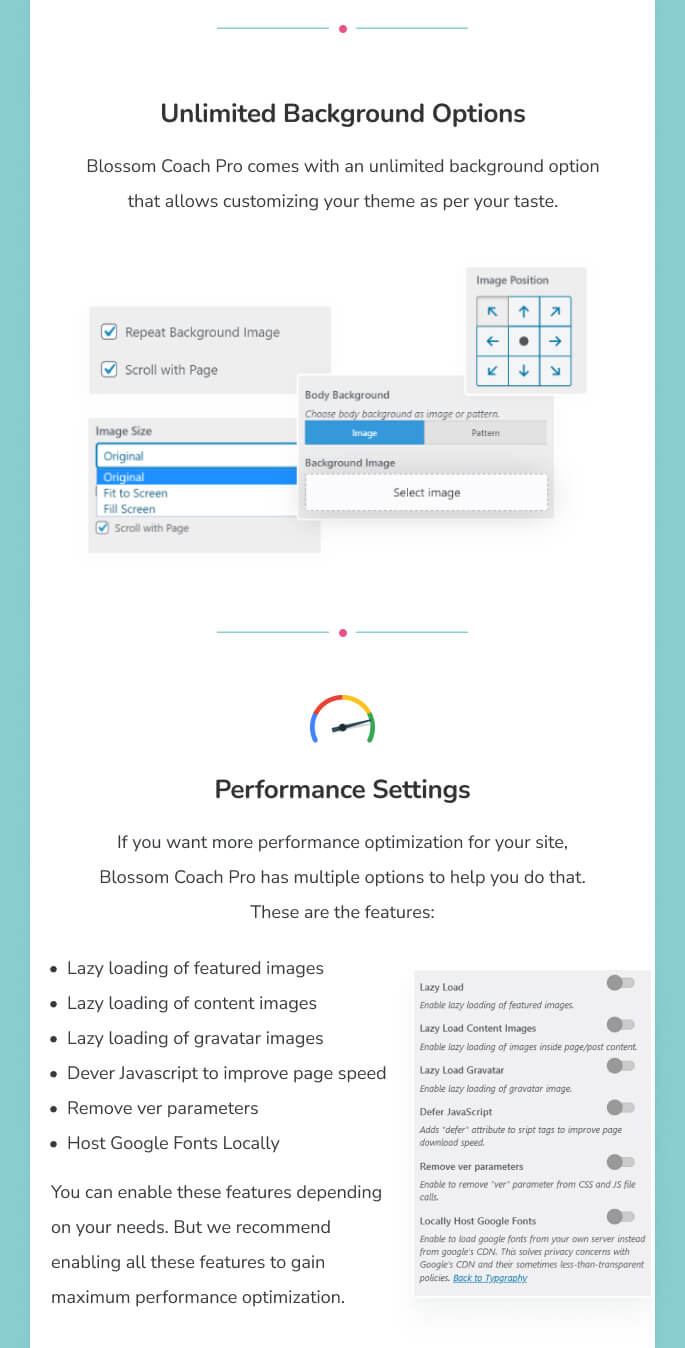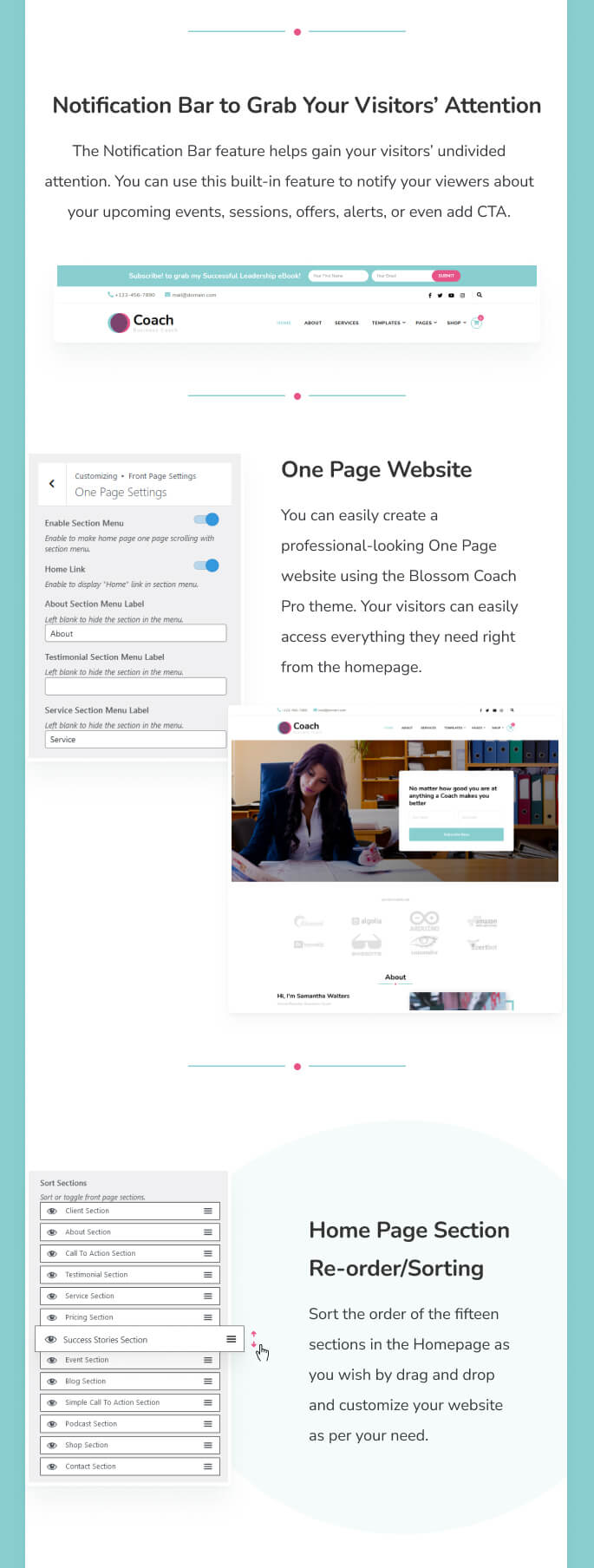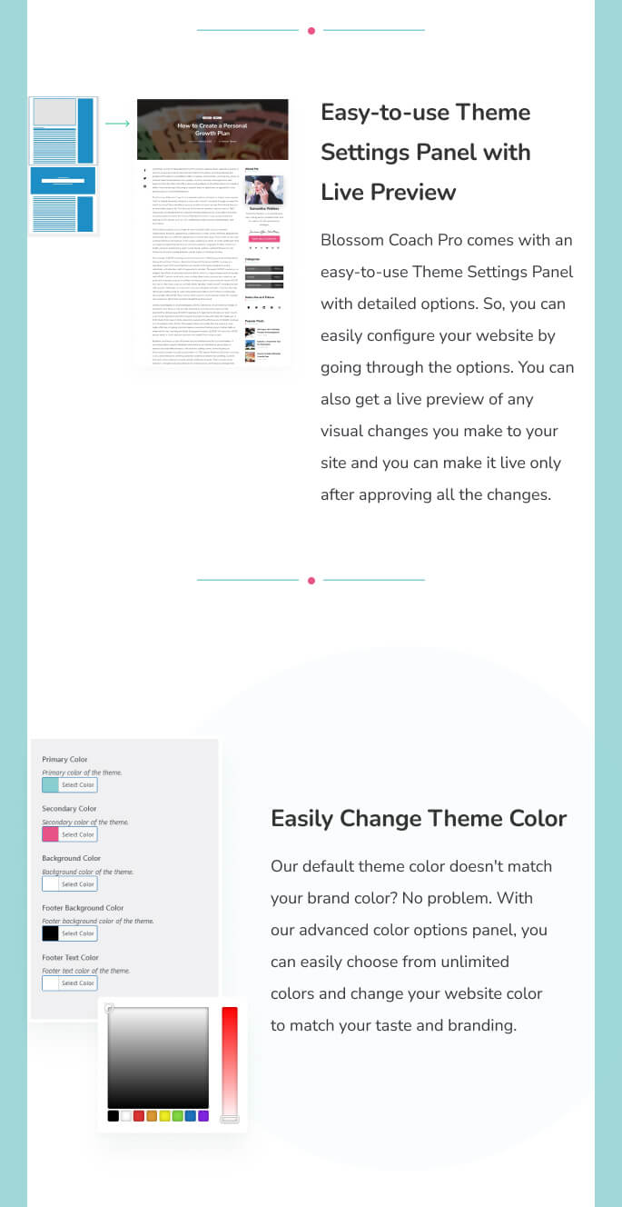 Blossom Coach Pro comes with an easy-to-use Theme Settings Panel with detailed options. So, you can easily configure your website by going through the options. You can also get a live preview of any visual changes you make to your site and you can make it live only after approving all the changes.