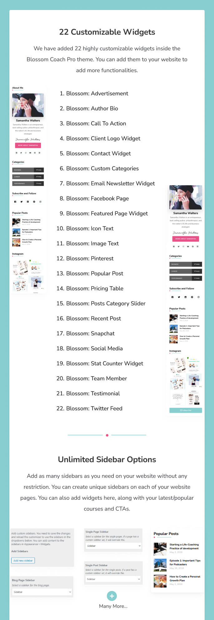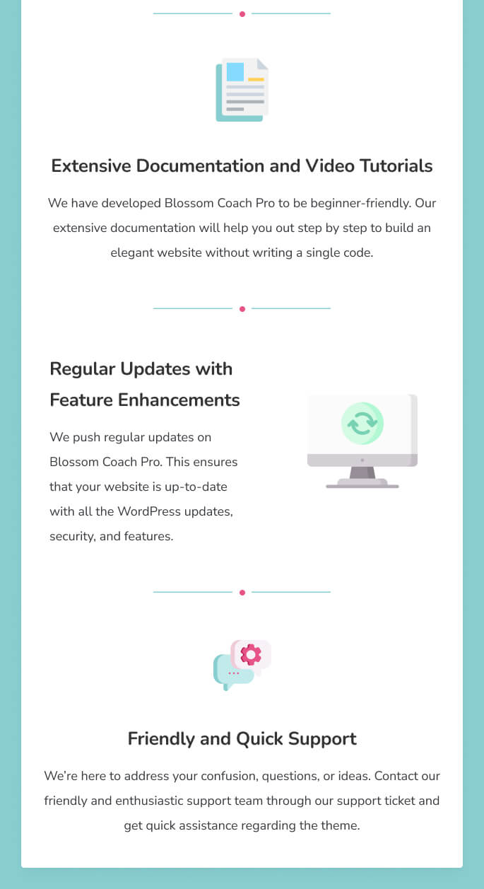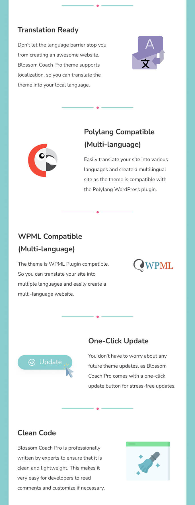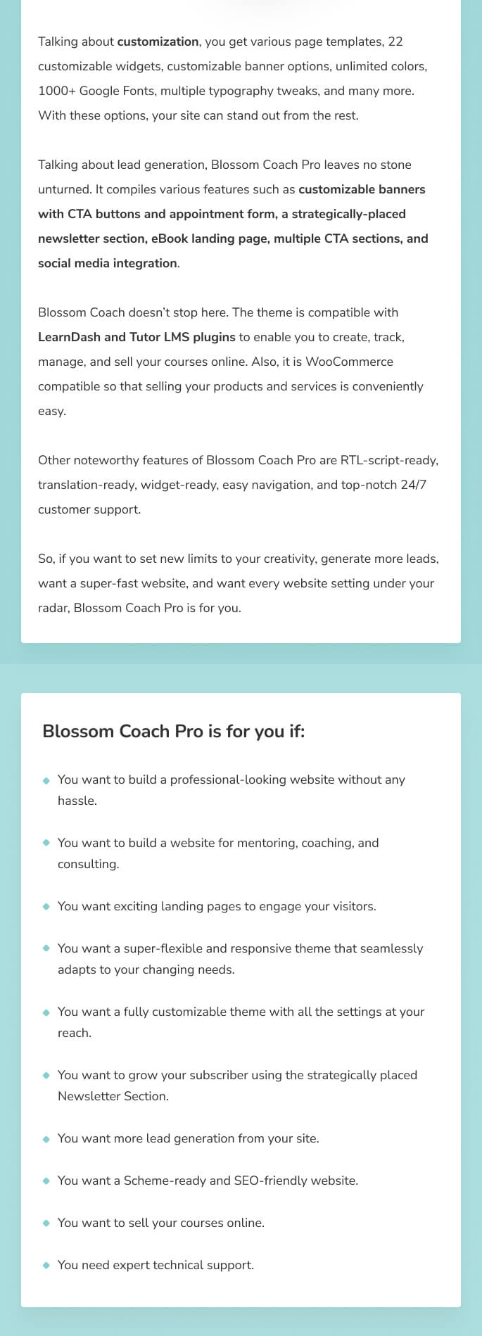 Other noteworthy features of Blossom Coach Pro are RTL-script-ready, translation-ready, widget-ready, easy navigation, and top-notch 24/7 customer support.