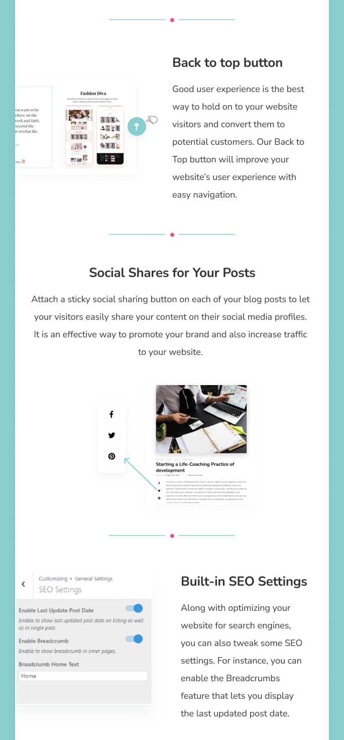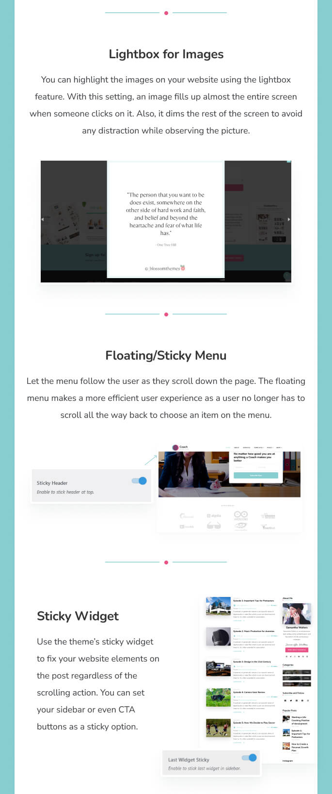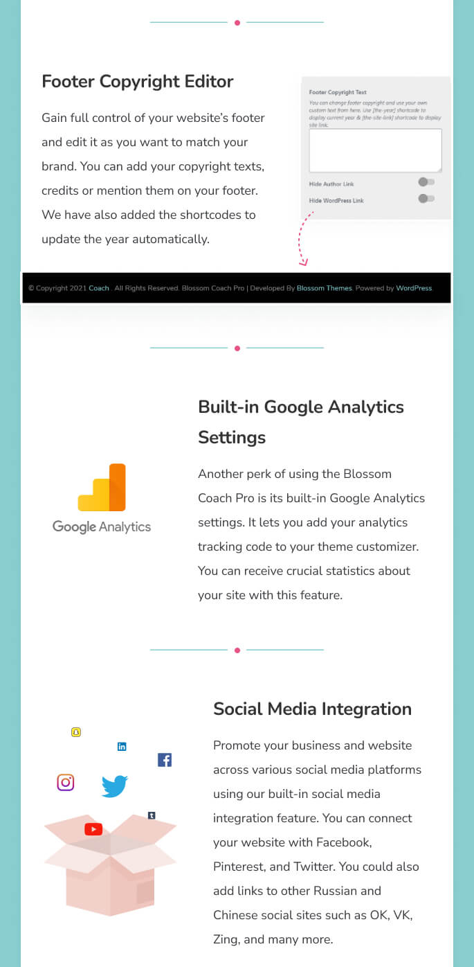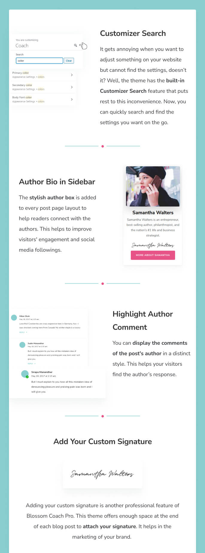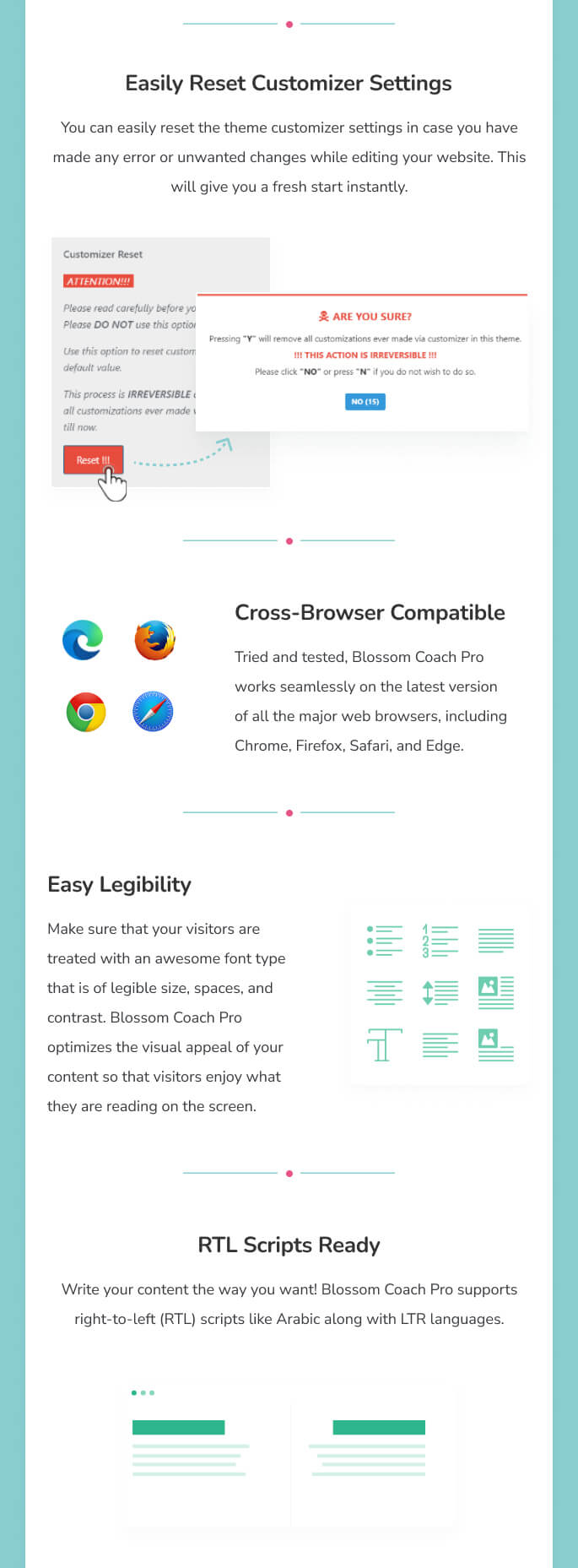 Other noteworthy features of Blossom Coach Pro are RTL-script-ready, translation-ready, widget-ready, easy navigation, and top-notch 24/7 customer support.